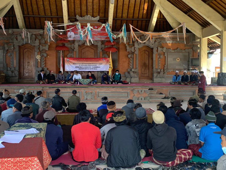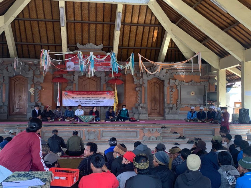 Pelakasnaan Kegiatan Ketahanan Pangan Desa di Bidang Pertanian di Desa Bayunggede dilaksanakan pada Hari/Tgl : Kamis, 11 Agustus 2022 bertempat di Wantilan Desa Bayunggede yang dihadiri oleh Perbekel, BPD, LPM, Kerta Desa dan Saba Desa Bayunggede, Babinsa, Babinkantibnas, PLD, Penyuluh Pertanian, serta Bapak/ibu Sang Ketut Sukarma S.P.MPd dan A.A.Gio Pradnya Dwi Permadi,STP ( Selaku Narasumber) dan pemberian Bibit Alpukat dan Bibit Jeruk kepada anggota Pelatihan