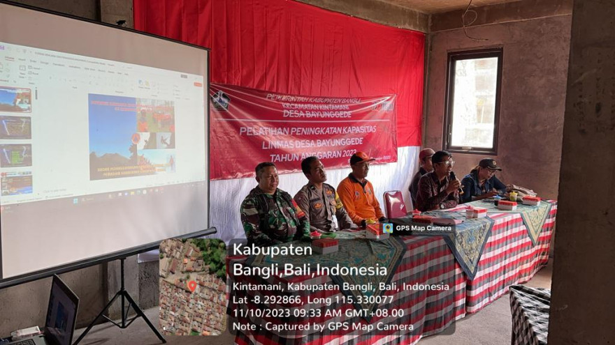 Kegiatan Pelatihan Peningkatan Kapsitas Linmas Desa Byaunggede dilaksanakan pada Hari/Tgl : Jumat, 10 Nopember 2023 di Aula Kantor Desa Bayunggede yang dihadiri Perbekel Bayunggede, Ketua BPD, Ketua LPM, Kadus Bayunggede dan Peludu dan Para Narasumber dari (BPBD, Kesbangpol Kab. Bangli, Kapolsek Kintamani, Damramil Kintamani ) dan Ketua Linmas Beserta Anggota sebagai peserta pelatihan